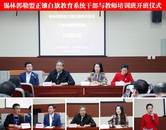 11月27日上午,内蒙古自治区锡林郭勒盟正镶白旗教育干部与教师培训班开班仪式在首都师范大学初等教育学院东区教学楼A719举行。内蒙古自治区锡林郭勒盟正镶白旗教育科技局师资股股长张慧琴、首都师范大学初等教育学院党委书记张润杰、首都师范大学初等教育学院副院长张志坤、培训班班主任钟晓琳、培训办公室主任杨小英等出席本次开班仪式。开班仪式由张志坤主持。
