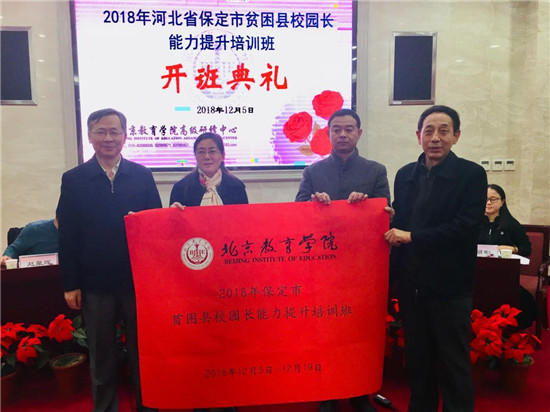 12月5日下午,“2018年河北省保定市贫困县校园长能力提升培训班”开班典礼在北京教育学院中轴路校区百人讲堂举行。北京教育学院党委书记杨公鼎、保定市教育局党组成员,副局长赵建民、北京市教委对口支援与经济合作处副调研员贺捷、保定市教育局对接办主任赵聚辉、北京教育学院高级研修中心主任陈丽、保定市中小学教师培训中心学校校长梁宝新、北京教育学院《丛书》办主任邢素丽参加开班典礼,活动由北京教育学院高研中心张丽彬老师主持。