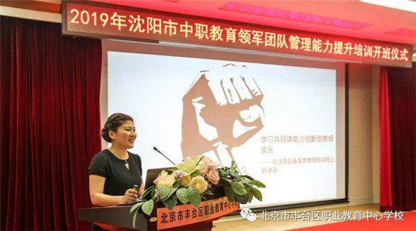 6月13日上午,在丰台区职业教育中心学校(以下简称“丰职”)芳古园校区举行了2019年京沈合作项目-沈阳市中等职业教育领军团队管理能力提升后备首席教师“以训代评”培训班开班仪式。25名沈阳职教名师将在丰职进行为期2周的培训。沈阳市教育研究院职业教育研究部部长徐秀林,沈阳市教育局职业与成人教育处副处长张金伟,沈阳市教育研究院职业教育研究部副部长范萍,沈阳市中等职业教育教学指导委员会委员、教授孙颖,沈阳市首席教师杨鹤,丰台区教委职成科科长吉战胜,丰台区职业与成人教育集团党委书记校长赵爱芹、党委副书记孙文荣,丰台区职业教育中心学校副校长芦倩英、副校长薛凤彩,新华社、人民日报、北京电视台等媒体记者参加了开班仪式。