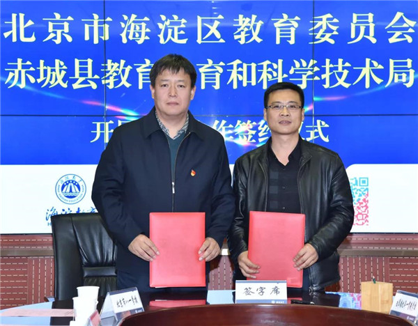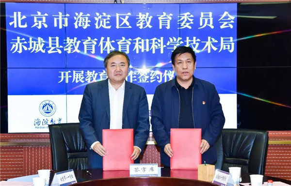 11月8日,海淀区教委与河北省张家口市赤城县教育体育和科学技术局签订了开展教育合作框架协议,双方各四所学校也结对成为“手拉手”合作学校。
