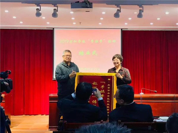 和田技师学院党委书记马占江代表和田地区职教联盟赠送锦旗,丰台区职业教育中心学校副校长芦倩英代表学校接受锦旗。
