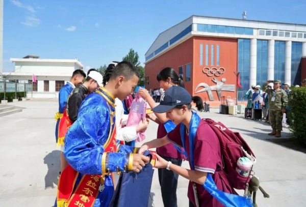 7月22日,北京第一批参加研学活动的学生抵达内蒙古海拉尔。这批十二三岁的少年,原本还有些许青春期的害羞和内向,但很快,京蒙两地的孩子们就开始感慨“虽从未谋面,但却颇有些相见恨晚之意”。研学团抵达海拉尔后,当地新海中学的二十余位同学身着民族服装,为远道而来的北京师生献上象征吉祥如意的蓝色哈达。来自北京的同学们则拿出早已准备好的校服熊、学校特色文创等伴手礼。学生们互相作自我介绍,虽是初见,但孩子们喜闻乐见的迎接方式让他们迅速熟络起来。