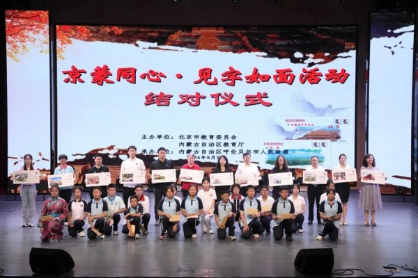 在第二期研学活动“京蒙同心 见字如面”结对仪式上,9对京蒙学生代表登上舞台,亲手交换了写给彼此的信件,将这份情谊珍藏。同时,活动还组织京蒙12所学校代表,手执印有学校校门和地址的巨幅明信片,两两结对,互换地址,建立起了互联机制,鼓励号召京蒙“笔友”们拿起纸笔交流文化,增进友谊,共话成长。这一独具匠心的设计旨在引导两地学生以“京蒙同心·见字如面”活动作为交往交流交融的新平台,为两地学校搭建新的桥梁,进一步加强交流合作,共同探索教育高质量发展的新路径。一封封书信将承载着京蒙两地师生双向奔赴的深情厚谊,更让民族团结之花在京蒙学子之间绽放。